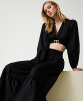 Le pantalon ample en popeline de coton stretch léger, avec volants froncés, taille élastique, poches italiennes et étiquette siglée Oval T à l’arrière, arbore un charme polyvalent. Il sera parfait avec des talons hauts ou des sandales plates.