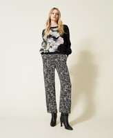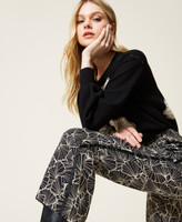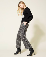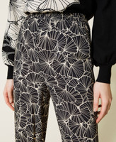 Dynamisez vos looks grâce à la touche graphique du pantalon palazzo en crêpe de viscose avec un motif exclusif Twinset qui représente l’élaboration graphique monochrome d’une feuille de ginkgo. Il arbore un élastique revêtu à la taille, des rayures d’inspiration sportive incrustées sur les côtés, des poches latérales, un pli marqué et une étiquette siglée Oval T à l’arrière. À interpréter avec des talons hauts ou des chaussures plates selon l’occasion.