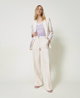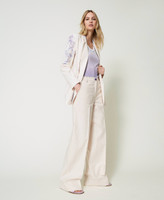 L’artiste MYFO signe ce pantalon palazzo en lin et coton dans les tons naturels, avec imprimé placé toile de Jouy. Il présente une fermeture éclair avec bouton en couleur contrasté, des poches italiennes et un pli marqué. Une couture exclusive à associer au blazer coordonné.