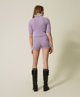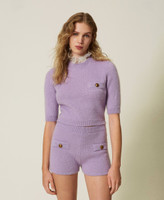 Pull « Charlotte » made in Italy en mohair mélangé avec col pierrot amovible en dentelle. Il présente un col rond, des manches longues aux coudes, un liseré avec bouton en métal, des bords-côtes et une coupe fluide.