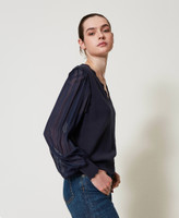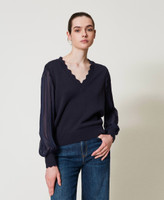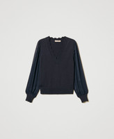 Pull en coton doté de manches longues en crépon de viscose avec rayures ton sur ton. Il présente une encolure en V et des poignets festonnés, des bords-côtes, une étiquette siglée Oval T et une coupe fluide.