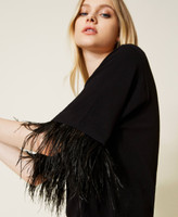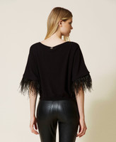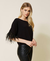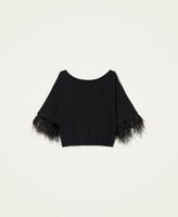 Pull boxy en viscose stretch avec col bateau et bas des manches rehaussé d’une passementerie de plumes amovible.