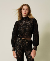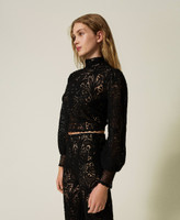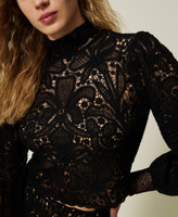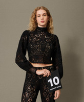 Pull en laine mélangée avec finition florale au crochet all-over. Il présente un col montant, une fermeture avec boutons revêtus de crochet dans le dos, des manches longues ballon, des bords festonnés et une coupe boxy.