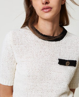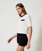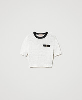 Pull cropped made in Italy en coton mélangé point jersey avec motif effet poche poitrine rehaussé d’un bouton siglé Oval T, col rond, manches courtes, bords-côtes et coupe fluide.