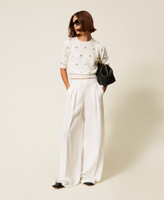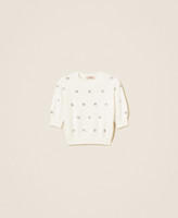 Pull en angora mélangé avec finition point jersey et application de chatons rivetés formant des fleurs. Il présente un col rond, des manches courtes, une étiquette siglée Oval T revêtue de fil dans le dos et une coupe fluide.