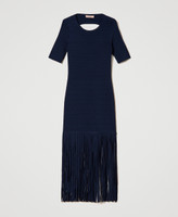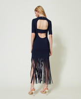 Robe courte ajustée en viscose stretch compacte avec finition tubulaire, franges dans le bas et ouverture dans le dos.