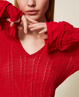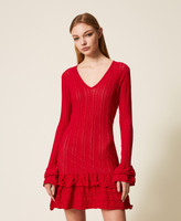 Robe courte en coton mélangé avec points tricotés créant des rayures verticales. Elle présente une profonde encolure en V, des volants sur les manches longues et dans le bas, une étiquette siglée Oval T dans le dos et une coupe ajustée.