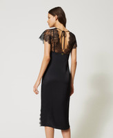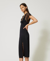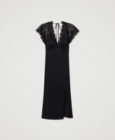 Robe courte en satin de viscose avec insertion en dentelle de Chantilly à motif floral festonné, fente latérale et fermeture éclair sur le côté.