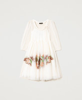Mini-robe en tulle avec broderie florale en fil et sequins, col rond réglable grâce à un cordon de serrage rehaussé de pompons dans le bas, empiècement et manches 3/4 en transparence, bord franc et doublure. Pour des looks spectaculaires et féminins.