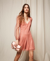 Robe courte en tulle plumetis avec profonde encolure profilée. Elle présente des manches longues non doublées, des poignets avec ouverture en goutte et bouton, une jupe dotée de pans pour créer du volume, une fermeture éclair sur le côté, une doublure en crêpe georgette, une étiquette siglée Oval T dans le dos, une coupe ajustée et une jupe fluide. Parfaite pour une fête ou une cérémonie.