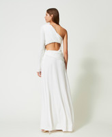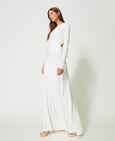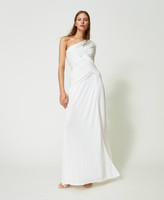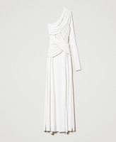 Robe longue asymétrique en jersey crêpé fluide de viscose avec finitions drapées croisées en basque et manches longues effet gants.
