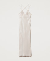 Robe longue en tissu brodé de sequins, avec bretelles spaghetti doubles, croisées dans le dos, fente dans le bas, fermeture éclair sur le côté et coupe ajustée. Parfaite pour une fête ou une cérémonie.