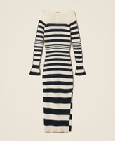 Robe longue en fil stretch composé à 74 % de coton biologique certifié et à 25 % de polyamide recyclé certifié. Construction sans coutures avec finition en point jersey et rayures bicolores. Elle présente un col rond, des manches longues avec emmanchures froncées, une fente latérale et une coupe ajustée. Les éventuelles petites impuretés sont propres aux matières recyclées et biologiques.