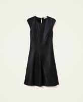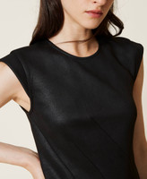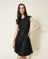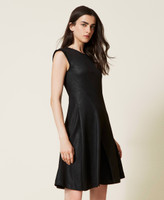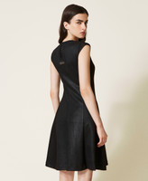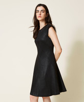 Robe mi-longue en twill de scuba a effet cuir velours avec découpes en éventail, fond à godet et mancherons.