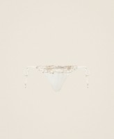 Slip brésilien de bain en tissu doublé avec taille rehaussée d’une broderie florale festonnée. Il présente des lacets à nouer sur les côtés avec embouts en perle et un cœur siglé en métal à l’arrière.