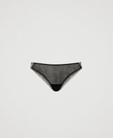 Slip brésilien en tulle lisse sur le devant, avec côtés et arrière en tulle brodé de feuilles et entrejambe à bord franc.
