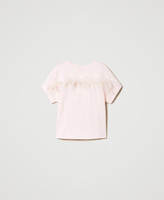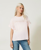 T-shirt en jersey de coton avec col rond, manches kimono, empiècement rehaussé de plumes assorties et étiquette Oval T.