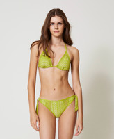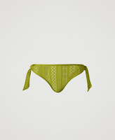Tanga de bain avec finition ajourée à motif géométrique effet dentelle. Il présente des lacets réglables sur les côtés, une doublure contrastée et un cœur siglé à l’arrière.