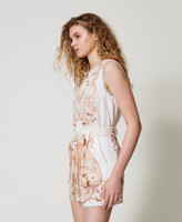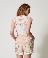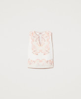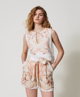 Top en lin avec imprimé floral placé style tapisserie, rehaussé d’une passementerie en demi-lune sur l’emmanchure et l’encolure. Il présente un col rond avec ouverture en V sur le devant, une étiquette siglée Oval T dans le dos et une coupe droite.
