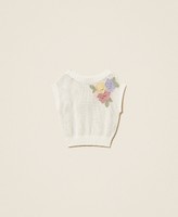 Top en maille 100 % coton avec application de fleurs brodées au crochet. Il présente une finition en filet, des bords-côtes, un col rond, des manches courtes avec épaules tombantes et une coupe fluide.