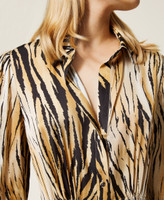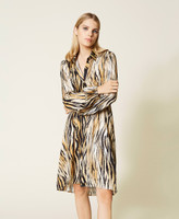 Robe chemisier en satin de viscose animalier, avec taille froncée, manches longues et bas asymétrique.