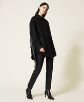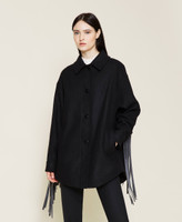 Blouson caban en drap de laine mélangée avec franges en tissu enduit réalisées au laser et incrustées sur les manches et l’empiècement dans le dos.