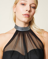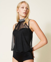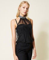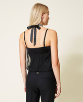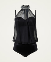 Body en satin stretch avec insertion en tulle doux et col rehaussé de strass appliqués, bande rembourrée et bretelles amovibles.