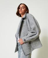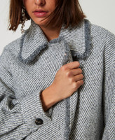Caban de la collection Actitude en drap avec motif diagonal bicolore et grands revers arrondis. Il présente des bords rehaussés de franges réalisées à la main, une fermeture croisée dotée de boutons effet corne, des manches longues avec plis dans le bas et grands poignets, des poches à rabat effiloché, des pinces dans le dos pour souligner le volume, une doublure et une coupe fluide.