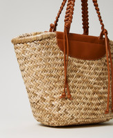 Cabas en paille naturelle tressée à la main avec détails effet cuir de veau, double anse tressée pour un porté main ou épaule et un sac intérieur amovible en toile, doté d’un cordon de serrage.