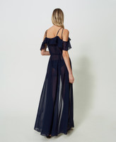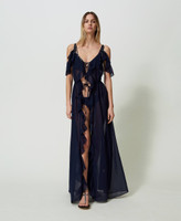 Caftan long en crêpe georgette avec volants, bretelles brodées à la main, volants sur les épaules et fermeture à lacet.