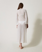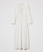Caftan avec finition crochet en forme de coquillage et encolure croisée, dotée de lacets se terminant par des anneaux et des pompons. Il présente des manches 3/4 évasées, des épaules montées, un cœur siglé en métal dans le dos et une coupe fluide.