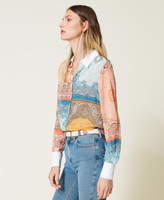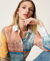 Chemise en crépon léger avec imprimé patchwork bandana, détails contrastés, top nuisette assorti.