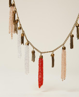 Collier en pièce galvanisée de laiton vieilli, avec pompons en chaînes métalliques et perles de verre multicolores.