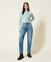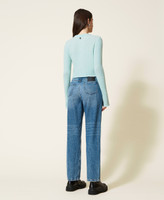 Un denim brillant. Jean droit avec délavage moyen clair et décolorations, poches rehaussées d’une application de franges en chaîne strassée, fermeture éclair et bouton-pression, taille regular.