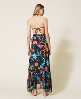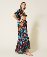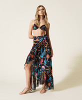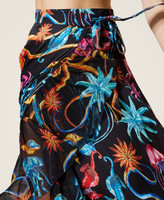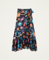 Jupe-paréo mi-longue en satin de viscose, avec imprimé, fermeture à lacets, volant dans le bas.