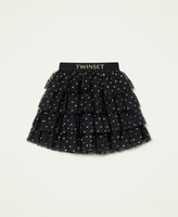 Jupe courte volantée en tulle floqué avec imprimé doré en relief, élastique siglé et doublure.