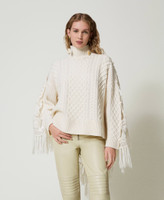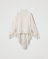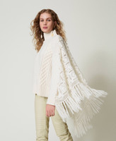 Maxi pull en laine mélangée avec jeux de points, col montant, manches longues, bords-côtes et coupe ample. Il est associé à une étole amovible en crochet tissé, rehaussée de franges appliquées à la main dans le bas qui s’accrochent grâce aux boutons assortis.