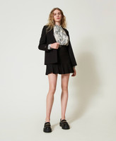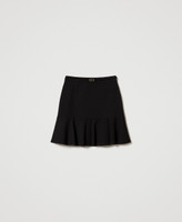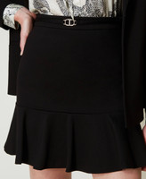Mini-jupe en point de Milan de viscose mélangée stretch avec bride et Oval T en métal à la taille, basque droite et volant dans le bas qui apporte du mouvement, fermeture éclair sur le côté et coupe évasée.