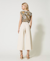 Le pantalon cropped en bull composé à 55 % de coton bio, coloré et légèrement traité, est éclectique et intemporel. Coupe ample, passants, taille haute, fermeture éclair et bouton siglé, poches plaquées sur le devant et bas effiloché. Le modèle fait partie du programme responsable Revive d’Actitude by Twinset.