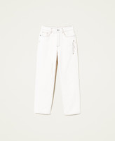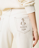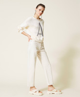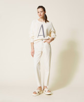 Une âme écologique et versatile pour le pantalon en bull composé à 55 % de coton bio, avec coupe droite et fluide, passants à la taille, cinq poches et surpiqûres contrastées. Le modèle fait partie du programme responsable Revive d’Actitude by Twinset, indiqué par l’inscription imprimée à l’intérieur de la taille.