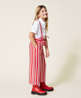 Pantalon cropped en viscose imprimée avec rayures irrégulières, ceinture en nœud, bretelles amovibles et réglables.