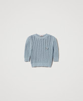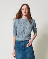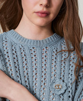 Pull en coton avec finition ajourée qui crée un effet de rayure verticale et broche brodée en crochet effet floral. Il présente une encolure ras-du-cou, des manches 3/4, des bords-côtes, une étiquette siglée Oval T et une coupe fluide.