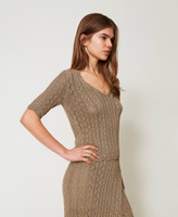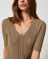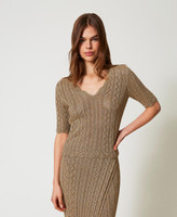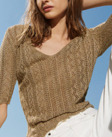 Pull en mélange de viscose et lurex avec une finition ajourée qui crée des motifs géométriques. Il présente une encolure en V, des manches courtes, des bords festonnés, une étiquette siglée Oval T et une coupe fluide.