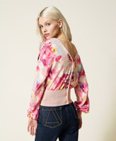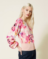 Pull double usage qui se transforme en cardigan. Réalisé en coton imprimé point jersey, avec col rond d’un côté et encolure en V de l’autre, larges bords-côtes unis.