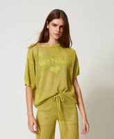 Pull en viscose tricotée en point filet, avec inscription siglée, encolure bateau, manches courtes côtelées dans le bas, cœur siglé dans le dos et coupe fluide.