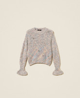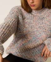 Pull de la collection Actitude en fil multicolore avec finition en côte perlée, encolure ras-du-cou, volants aux poignets, étiquette siglée dans le dos et coupe fluide.