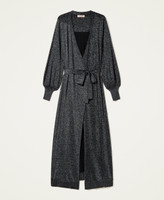 Robe longue double usage (elle peut également se porter comme cardigan) en viscose mélangée et lurex avec ceinture assortie.