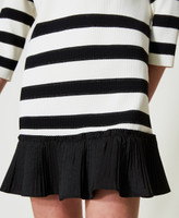 Robe courte en maille de viscose crêpée stretch avec lurex, volant en taffetas travaillé en plissé accordéon, col rond et manches longues.