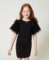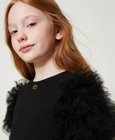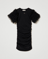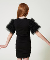Robe courte en jersey stretch avec manches courtes en tulle rehaussées de volants froncés, côtés drapés, col rond et Oval T.