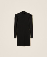 Robe courte de la collection Actitude en maille de viscose mélangée avec motif drapé sur les épaules. Elle présente un col montant, des manches longues, une étiquette siglée en métal dans le dos et une coupe ajustée. La viscose utilisée pour ce modèle (81 % de viscose) est obtenue à partir du traitement de coton recyclé pré-consommation.